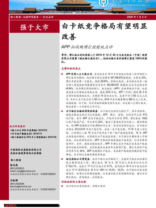 【中银证券】【20200102】轻工制造行业点评:APP拟收购博汇控股权点评-白卡纸竞争格局有望明显改善-5页