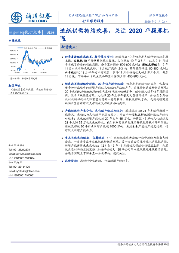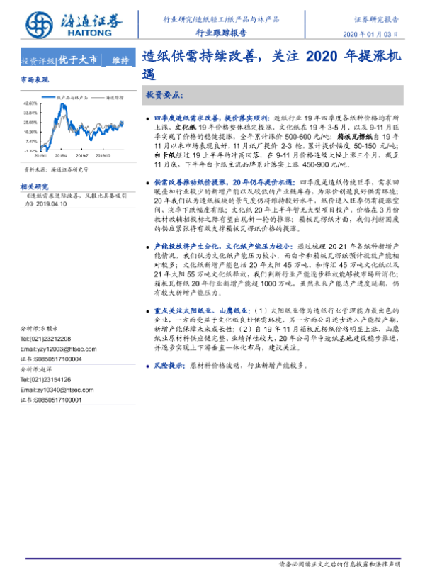 【海通证券】【20200103】纸产品与林产品:造纸供需持续改善,关注2020年提涨机遇-9页