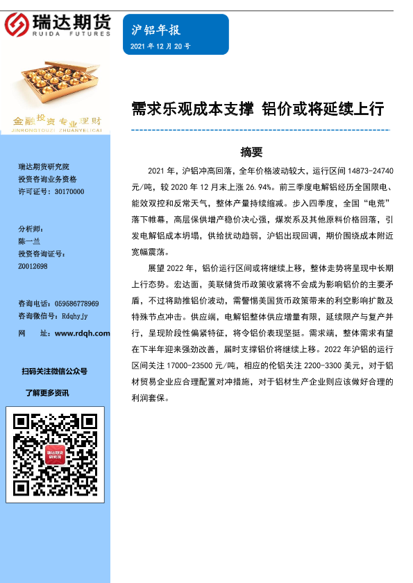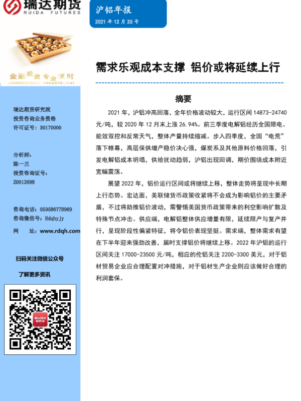 【瑞达期货】【20211220】沪铝年报:需求乐观成本支撑,铝价或将延续上行-15页