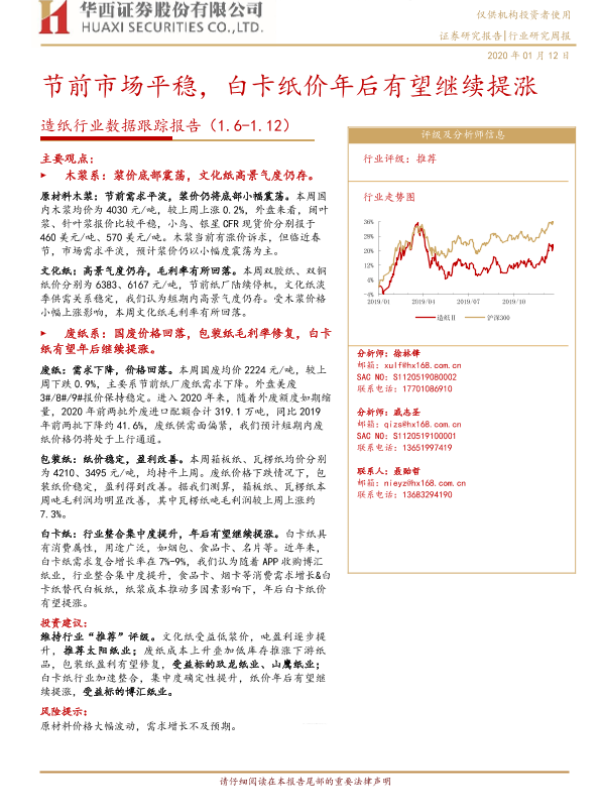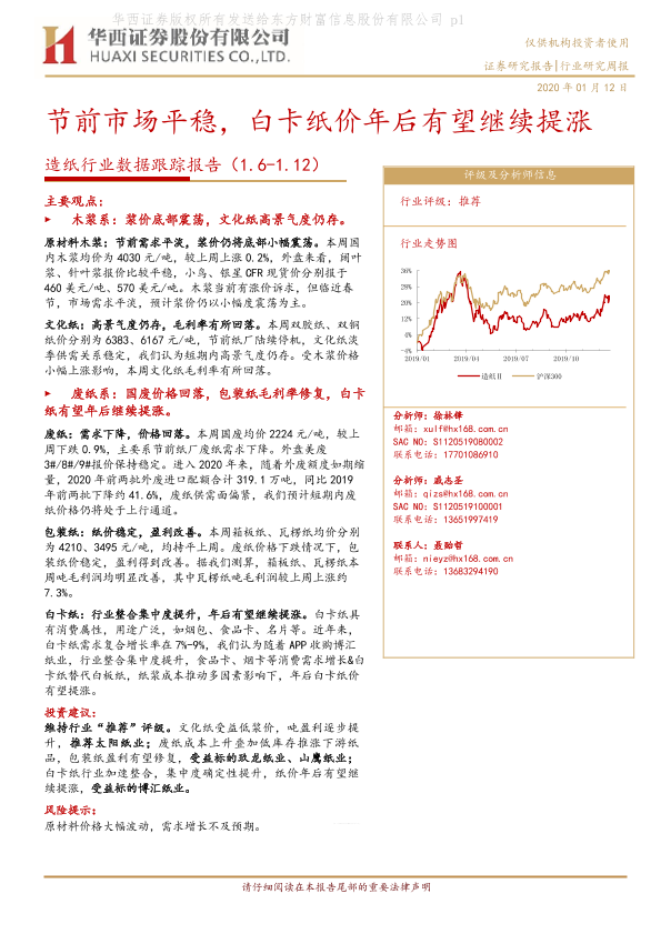【华西证券】【20200112】节前市场平稳,白卡纸价年后有望继续提涨-8页
