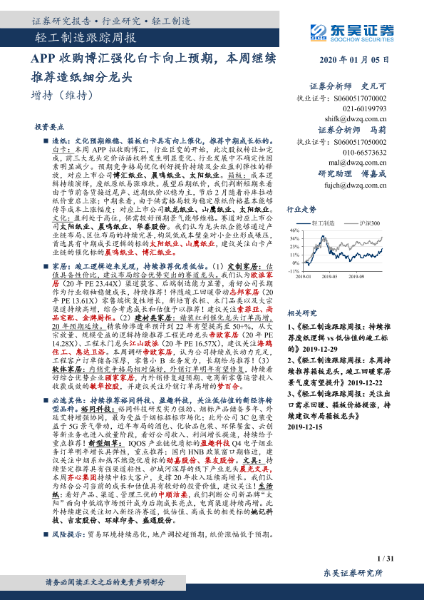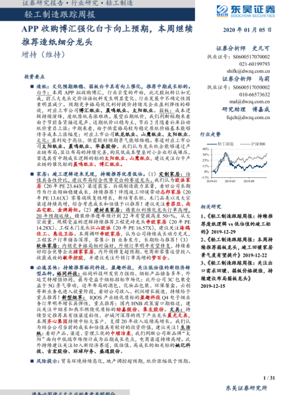 【东吴证券】【20200105】20200105-东吴证券-轻工制造跟踪周报:APP收购博汇强化白卡向上预期,本周继续推荐造纸细分龙头-31页