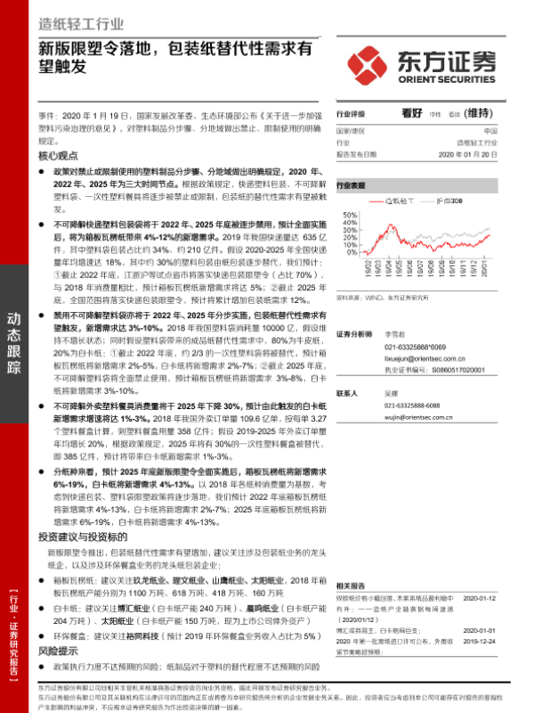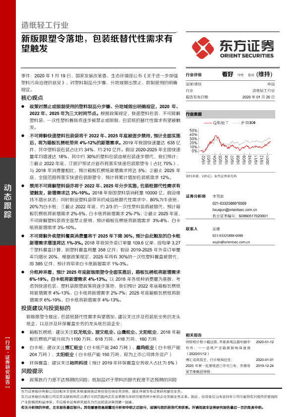 【东方证券】【20200120】造纸轻工行业:新版限塑令落地,包装纸替代性需求有望触发-12页