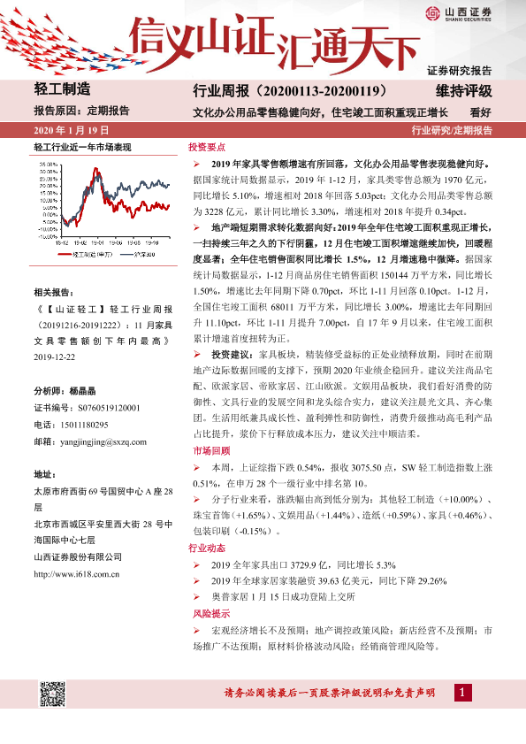 【山西证券】【20200119】轻工制造行业周报:文化办公用品零售稳健向好,住宅竣工面积重现正增长-15页
