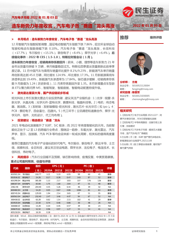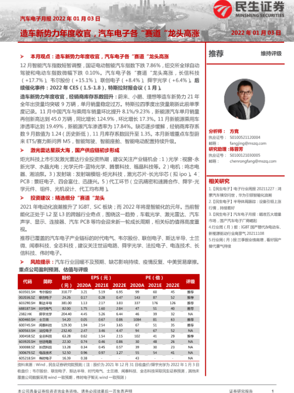 【民生证券】【20220103】汽车电子行业月报:造车新势力年度收官,汽车电子各“赛道“龙头高涨-18页
