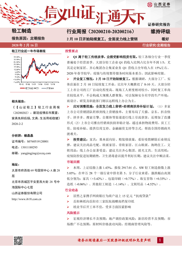 【山西证券】【20200216】20200216-山西证券-轻工制造行业周报:2月10日开始陆续复工,全面发力线上营销-14页