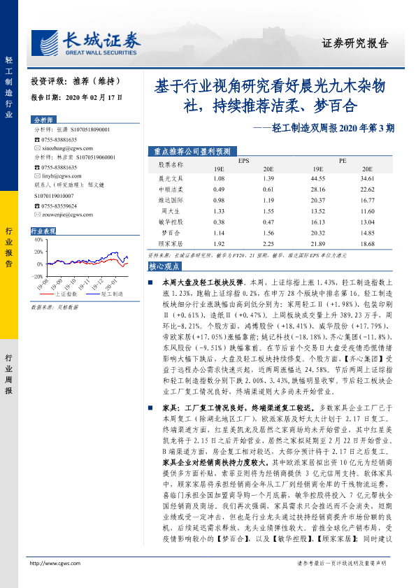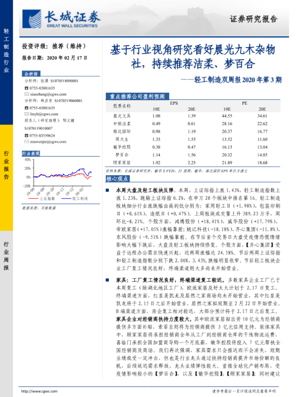 【长城证券】【20200217】轻工制造双周报2020年第3期:基于行业视角研究看好晨光九木杂物社,持续推荐洁柔、梦百合-42页