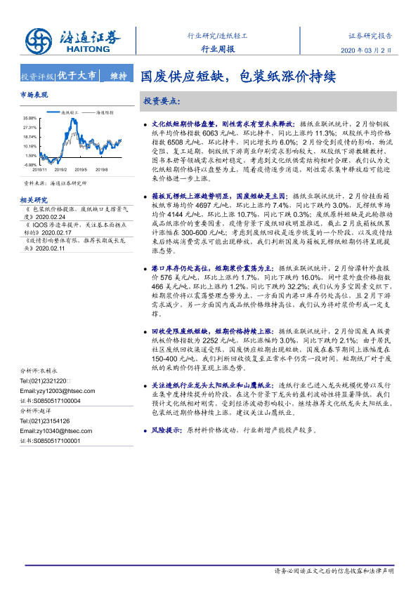 【海通证券】【20200302】20200302-海通证券-造纸轻工行业周报:国废供应短缺,包装纸涨价持续-6页