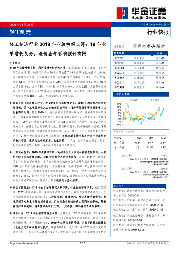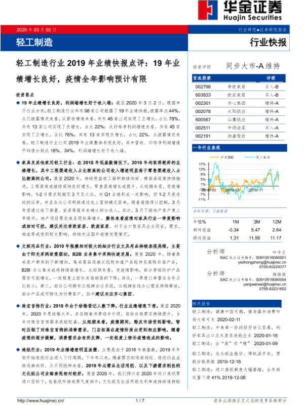 【华金证券】【20200302】轻工制造行业2019年业绩快报点评:19年业绩增长良好,疫情全年影响预计有限-7页