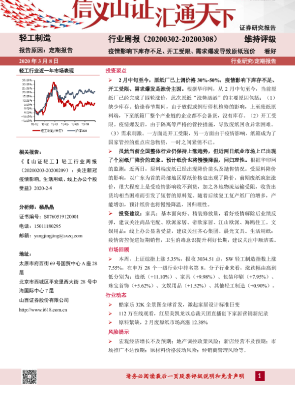 【山西证券】【20200308】20200308-山西证券-轻工制造行业周报:疫情影响下库存不足、开工受限、需求爆发导致原纸涨价-13页