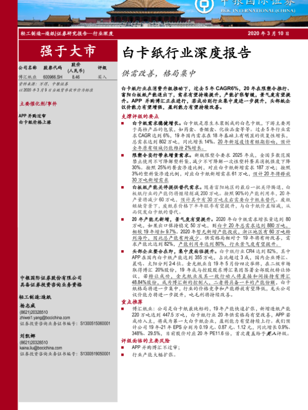 【中银证券】【20200310】中银证券-白卡纸行业深度报告:供需改善,格局集中-27页