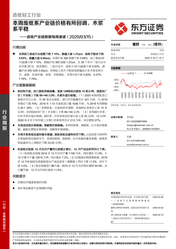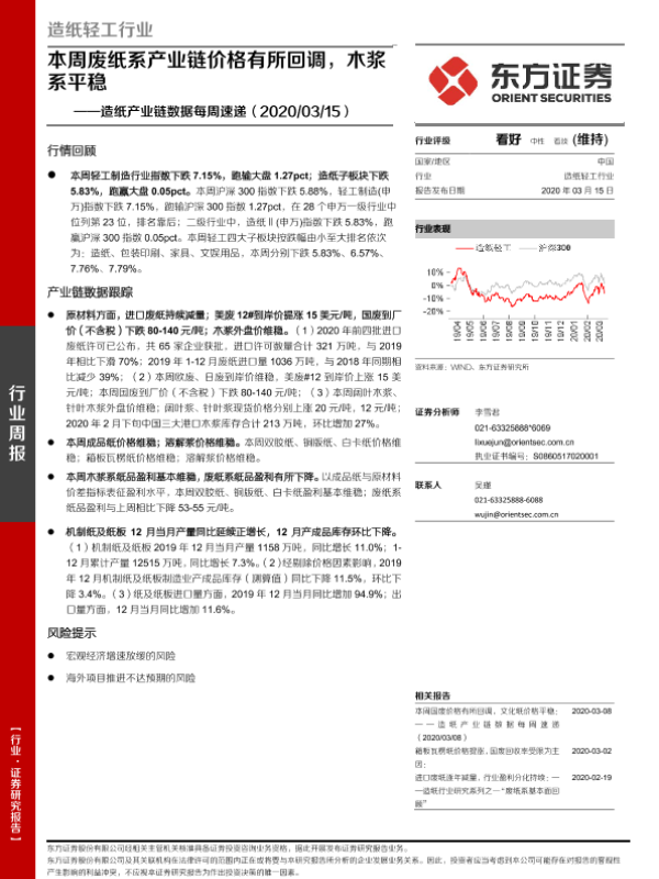 【东方证券】【20200315】20200315-东方证券-造纸产业链数据每周速递:本周废纸系产业链价格有所回调,木浆系平稳-14页