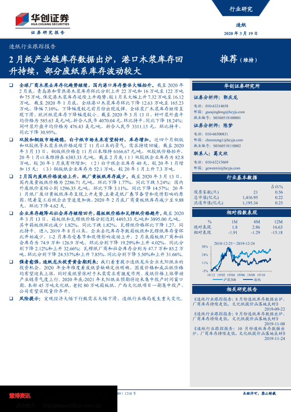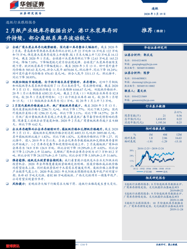【华创证券】【20200319】20200319-华创证券-造纸行业跟踪报告:2月纸产业链库存数据出炉,港口木浆库存回升持续,部分废纸系库存波动较大-11页