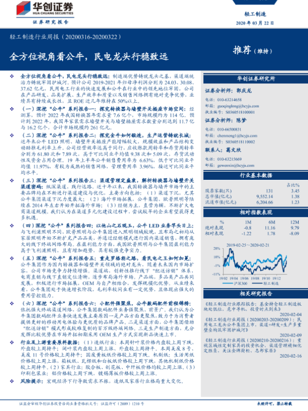【华创证券】【20200322】轻工制造行业周报:全方位视角看公牛,民电龙头行稳致远-15页