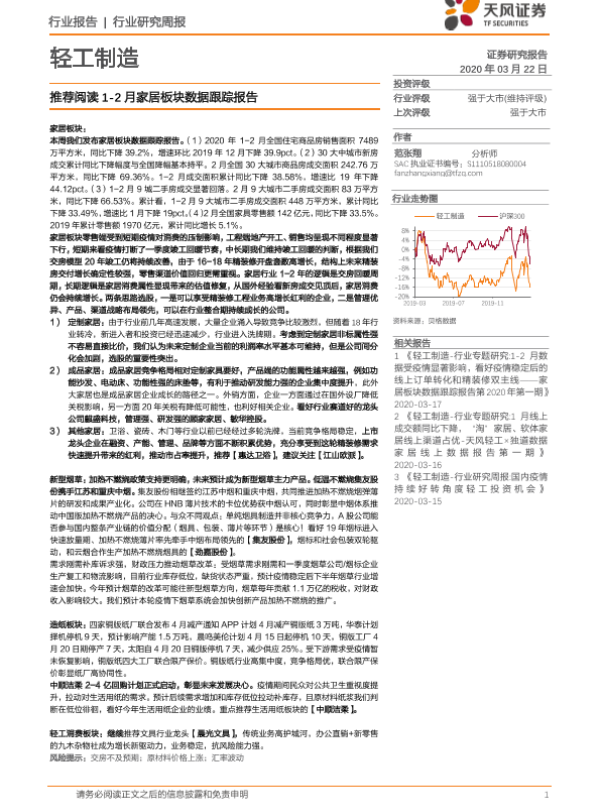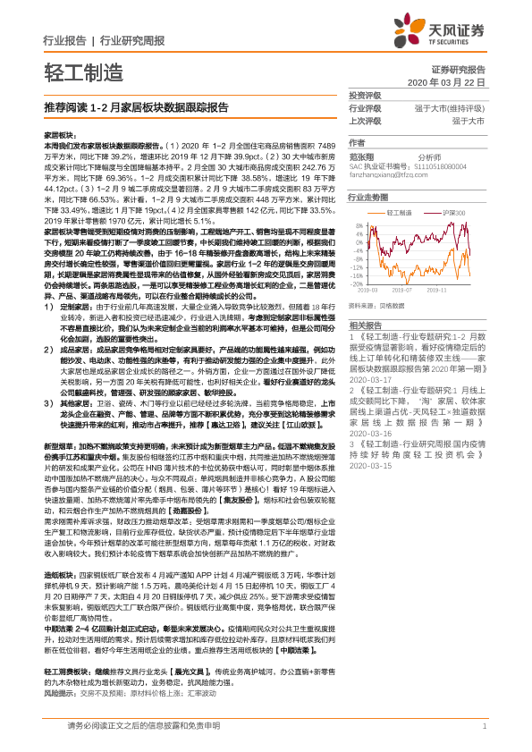 【天风证券】【20200322】轻工制造行业研究周报:推荐阅读1-2月家居板块数据跟踪报告-22页