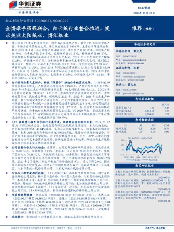 【华创证券】【20200329】20200329-华创证券-轻工制造行业周报:金博牵手强强联合,白卡纸行业整合推进,提示关注太阳纸业、博汇纸业-14页