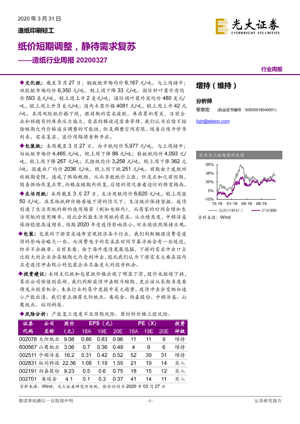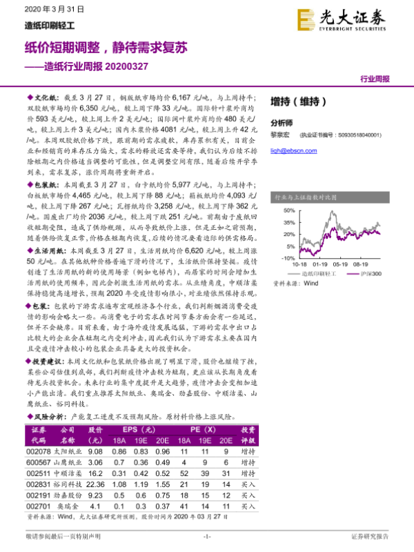 【光大证券】【20200331】20200331-光大证券-造纸行业周报:纸价短期调整,静待需求复苏-14页