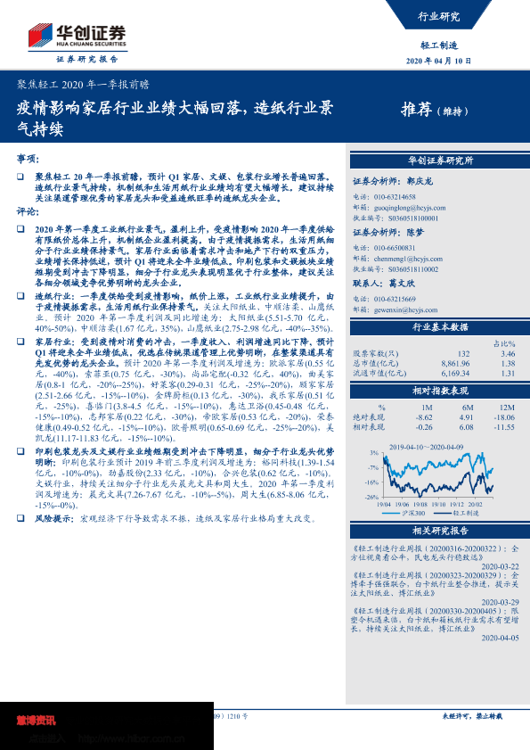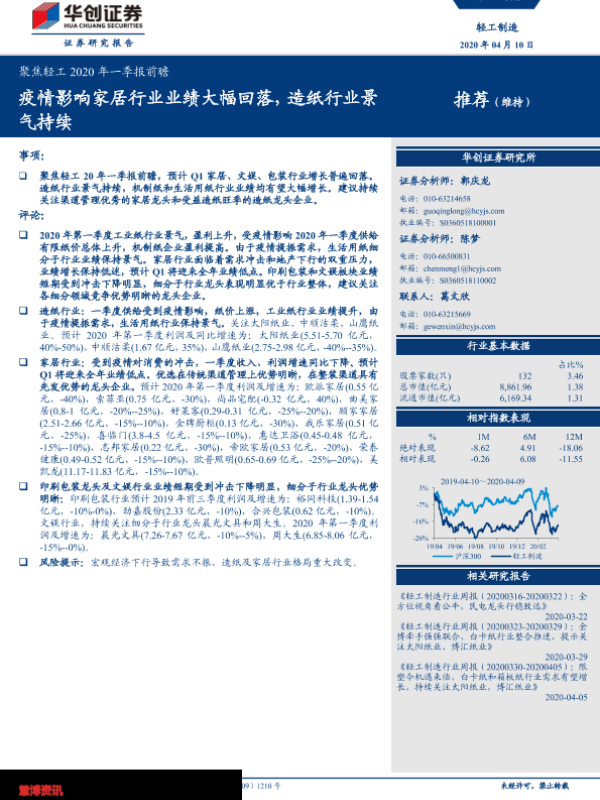 【华创证券】【20200410】聚焦轻工2020年一季报前瞻:疫情影响家居行业业绩大幅回落,造纸行业景气持续-5页