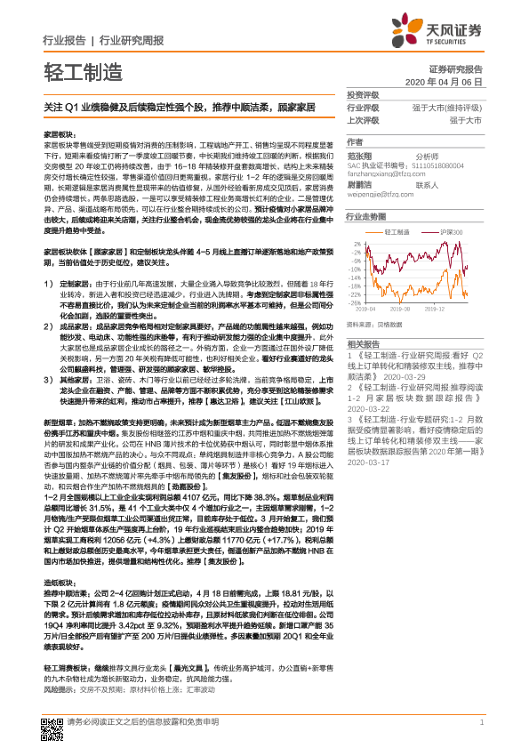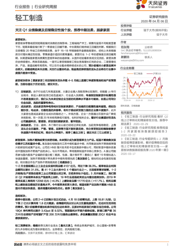 【天风证券】【20200406】轻工制造行业研究周报:关注Q1业绩稳健及后续稳定性强个股,推荐中顺洁柔,顾家家居-22页