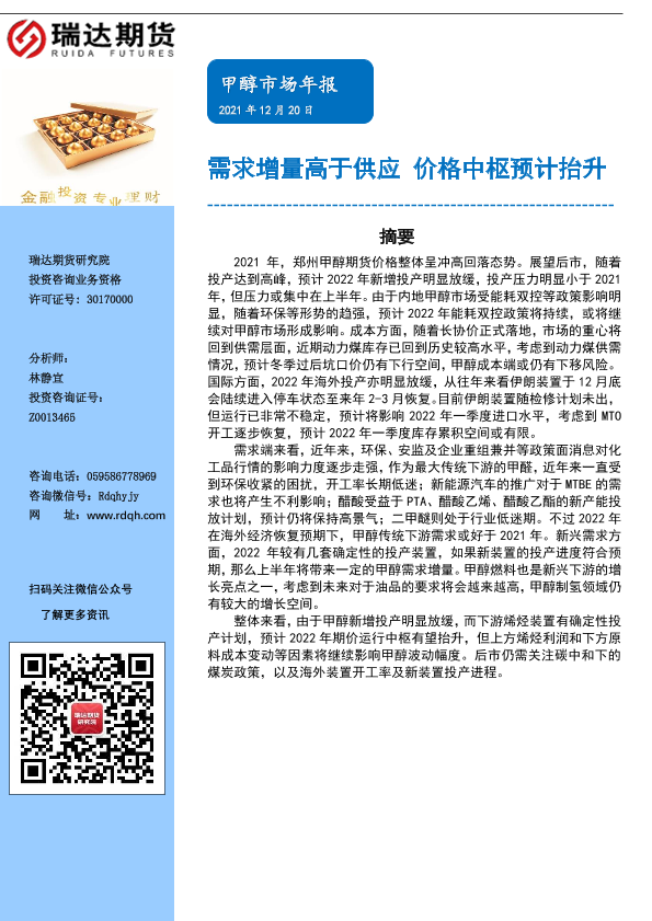 【瑞达期货】【20211220】甲醇市场年报:需求增量高于供应,价格中枢预计抬升-15页