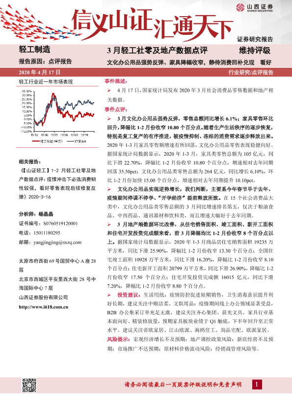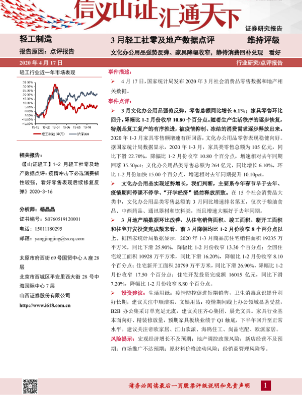 【山西证券】【20200417】3月轻工社零及地产数据点评:文化办公用品强势反弹、家具降幅收窄,静待消费回补兑现-5页