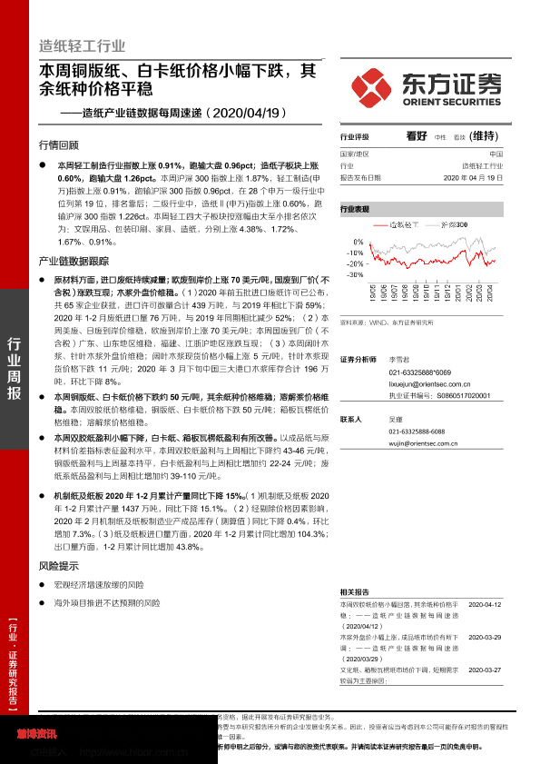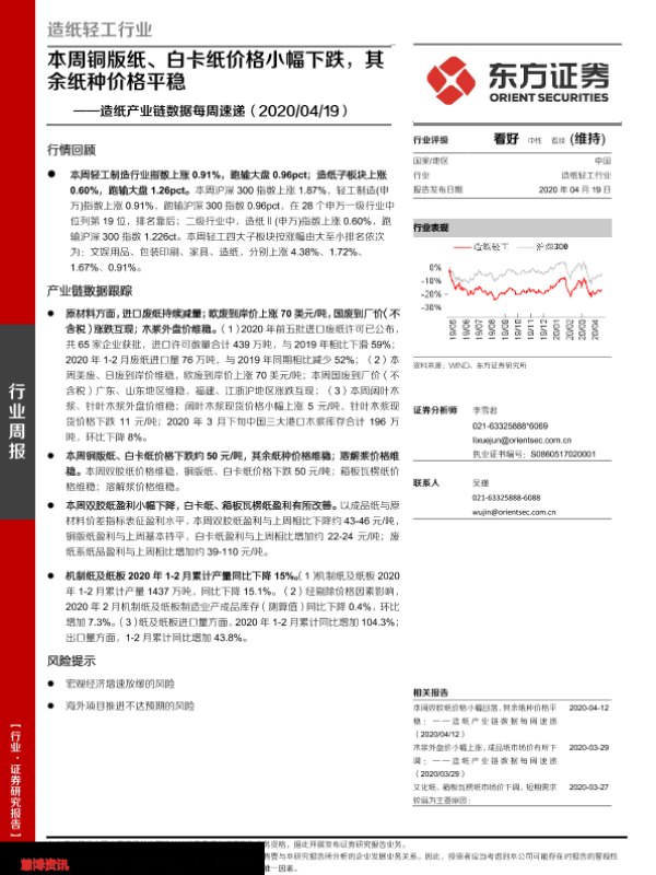 【东方证券】【20200419】20200419-东方证券-造纸产业链数据每周速递:本周铜版纸、白卡纸价格小幅下跌,其余纸种价格平稳-14页