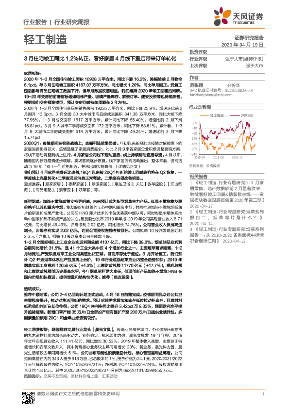 【天风证券】【20200419】20200419-天风证券-轻工制造行业研究周报:3月住宅竣工同比1.2%转正,看好家居4月线下重启带来订单转化-21页