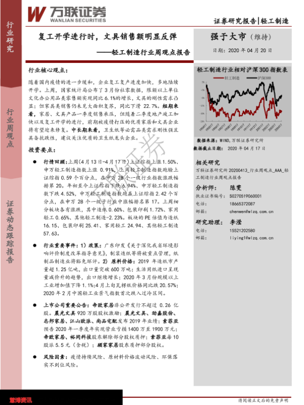 【万联证券】【20200420】复工开学进行时,文具销售额明显反弹 ——轻工制造行业周观点报告-8页