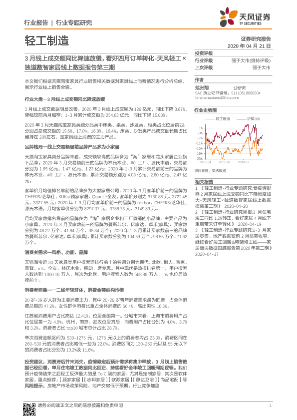 【天风证券】【20200421】天风轻工×独道数智家居线上数据报告第三期:3月线上成交额同比降速放缓,看好四月订单转化-11页