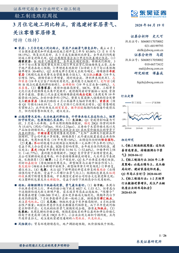 【东吴证券】【20200419】20200419-东吴证券-轻工制造跟踪周报:3月住宅竣工同比转正,首选建材家居景气、关注零售家居修复-26页