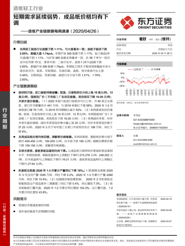 【东方证券】【20200426】20200426-东方证券-造纸产业链数据每周速递:短期需求延续弱势,成品纸价格均有下调-14页