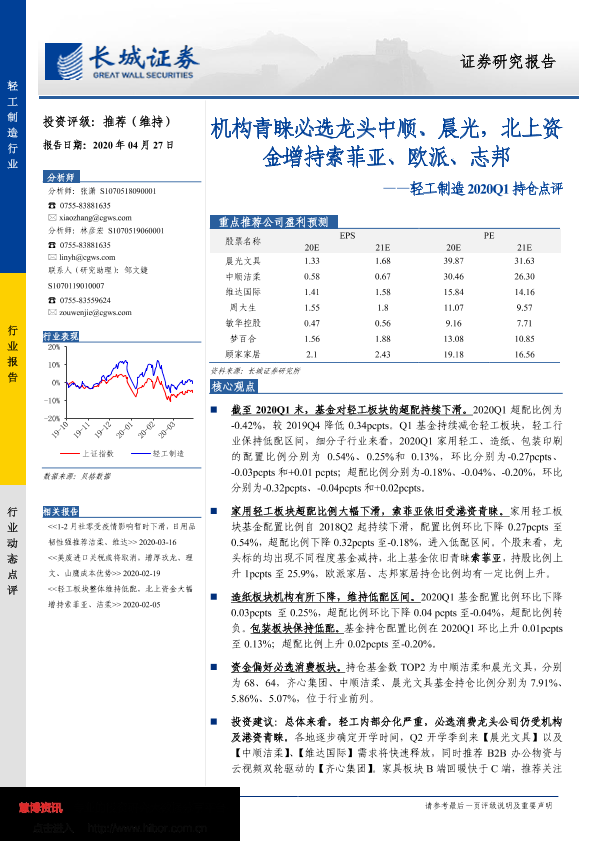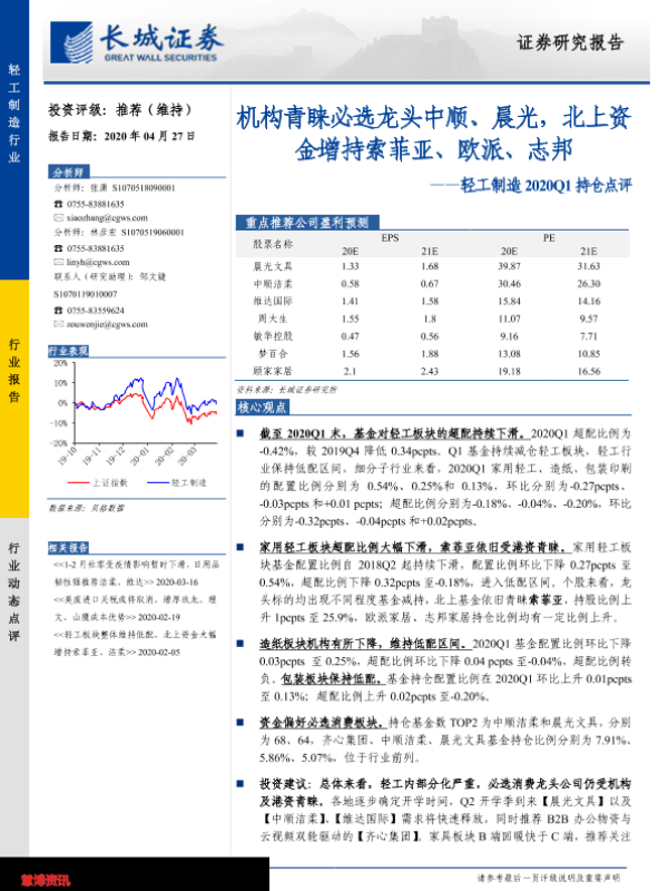【长城证券】【20200427】轻工制造2020Q1持仓点评:机构青睐必选龙头中顺、晨光,北上资金增持索菲亚、欧派、志邦-9页