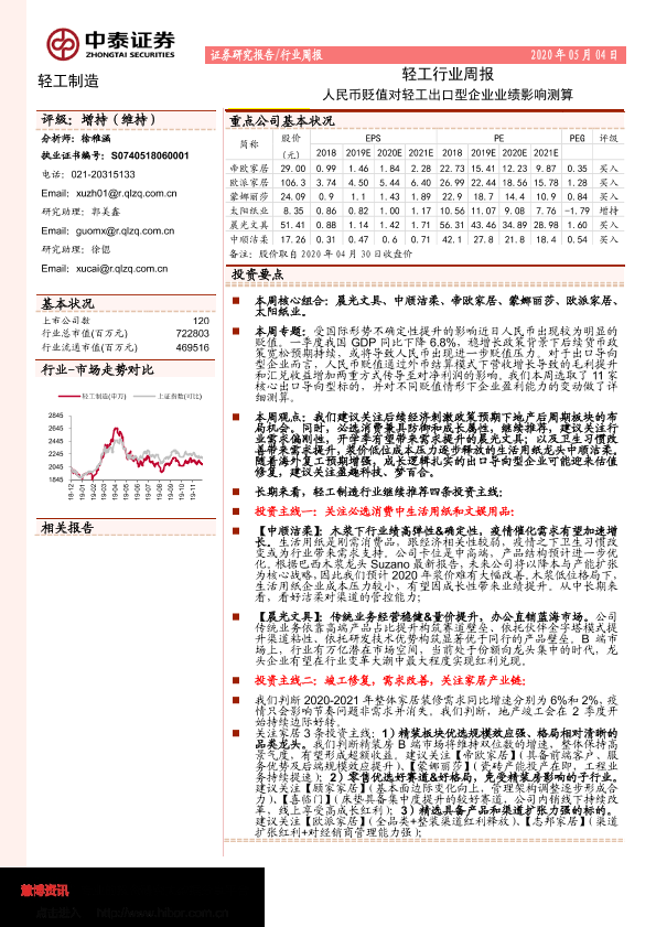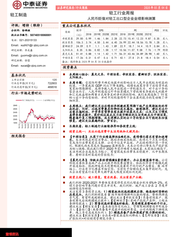 【中泰证券】【20200504】20200504-中泰证券-轻工行业周报:人民币贬值对轻工出口型企业业绩影响测算-21页