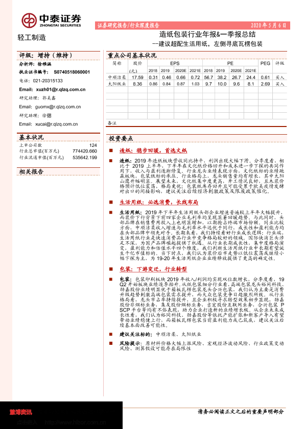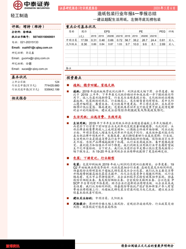 【中泰证券】【20200506】20200506-中泰证券-造纸包装板块年报&一季报总结:建议超配生活用纸,左侧寻底瓦楞包装-31页