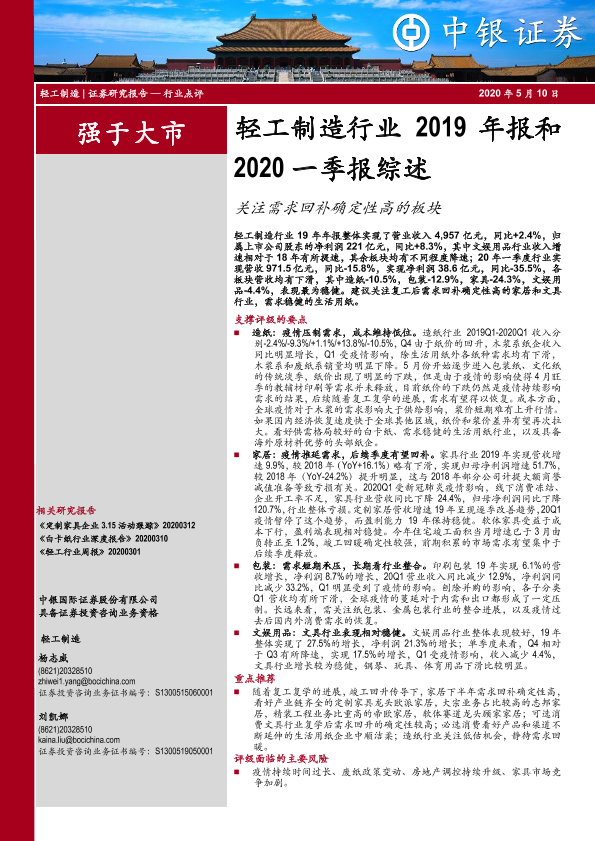 【中银证券】【20200510】轻工制造行业2019年报和2020一季报综述:关注需求回补确定性高的板块-23页
