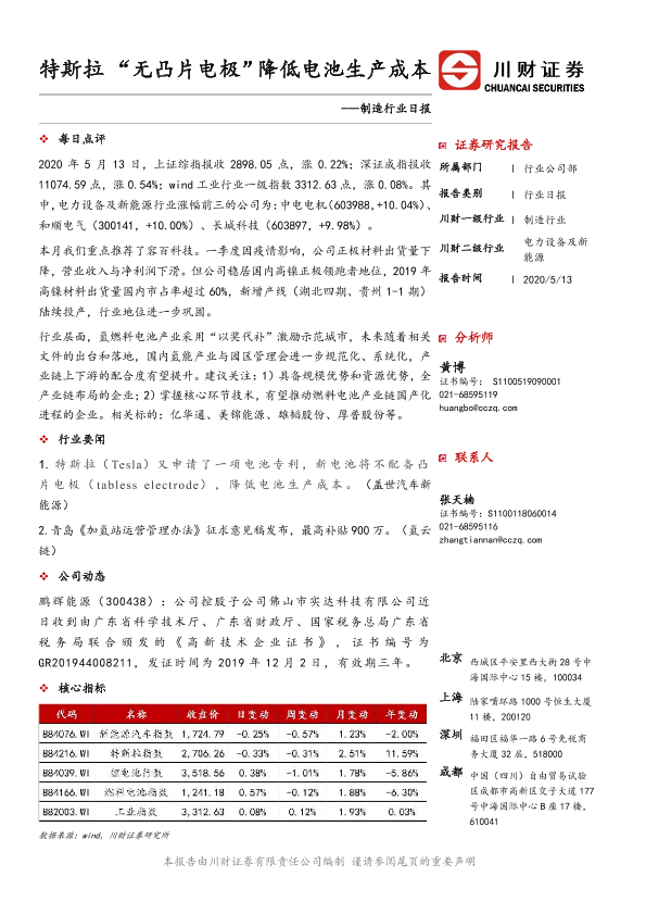【川财证券】【20200513】制造行业日报:特斯拉 “无凸片电极”降低电池生产成本-3页