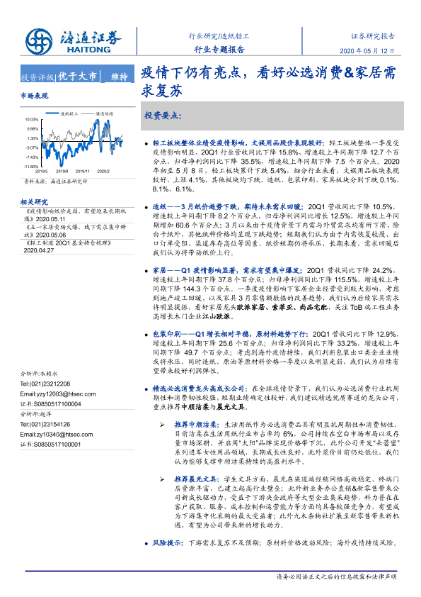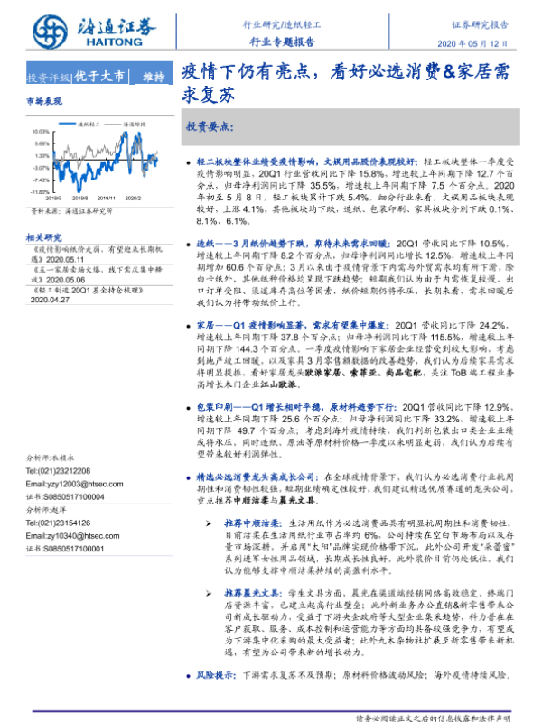 【海通证券】【20200512】20200512-海通证券-造纸轻工行业专题报告:疫情下仍有亮点,看好必选消费&家居需求复苏-19页