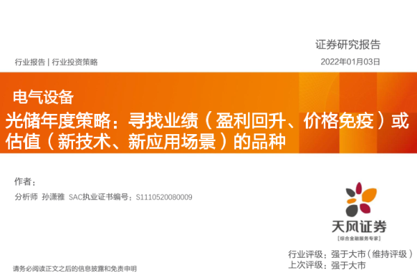 【天风证券】【20220103】电气设备行业光储年度策略:寻找业绩(盈利回升、价格免疫)或估值(新技术、新应用场景)的品种-60页