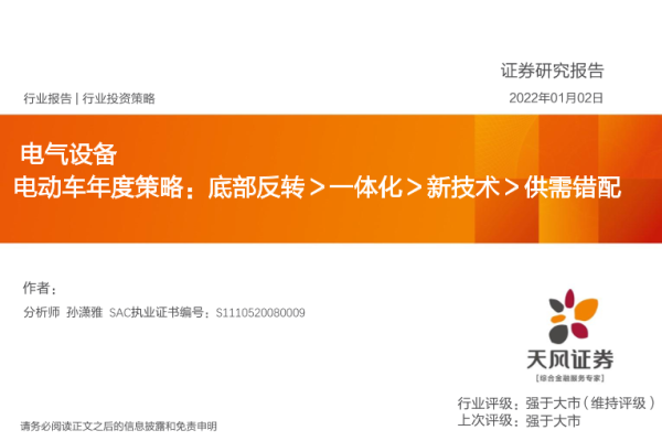 【天风证券】【20220102】电气设备行业电动车年度策略:底部反转>一体化>新技术>供需错配-114页