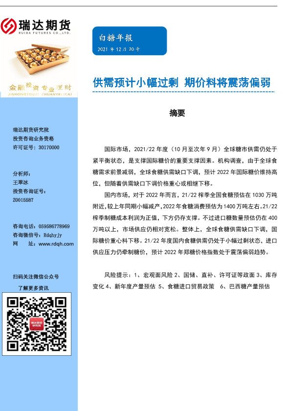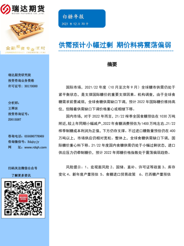 【瑞达期货】【20211220】白糖年报:供需预计小幅过剩,期价料将震荡偏弱-19页