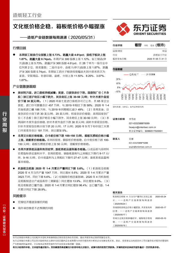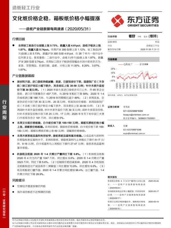 【东方证券】【20200531】20200531-东方证券-造纸产业链数据每周速递:文化纸价格企稳,箱板纸价格小幅提涨-14页