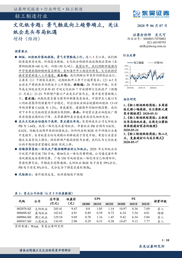 【东吴证券】【20200607】轻工制造行业:文化纸专题:景气触底向上趋势确立,关注纸企龙头布局机遇-10页