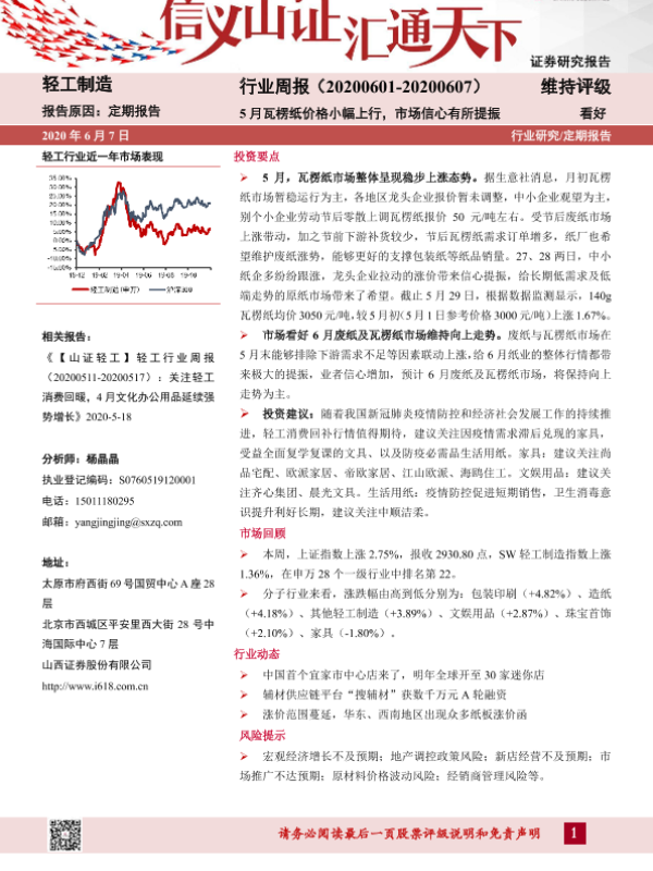 【山西证券】【20200607】20200607-山西证券-轻工制造行业周报:5月瓦楞纸价格小幅上行,市场信心有所提振-14页