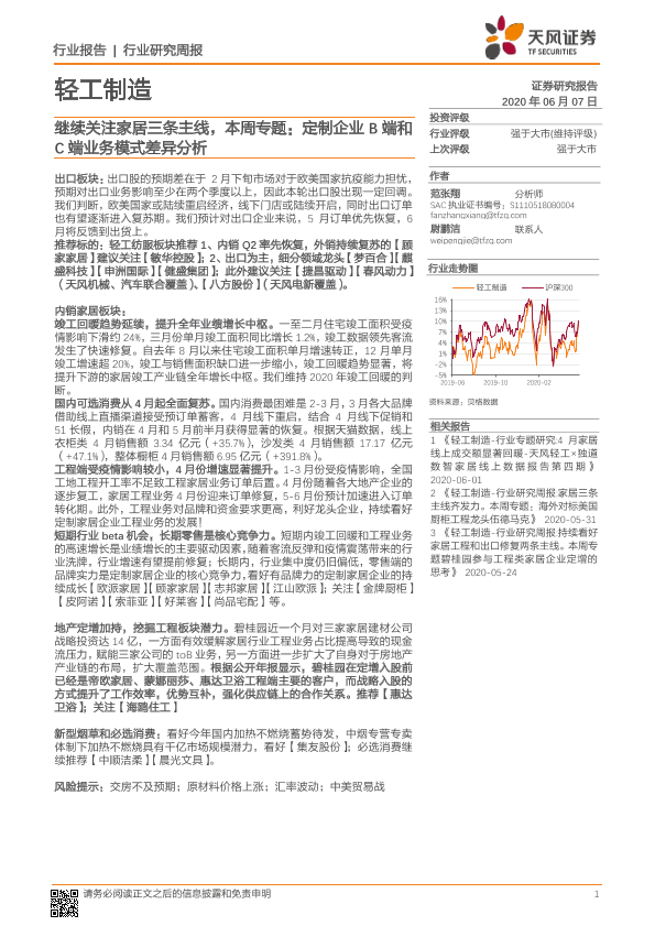 【天风证券】【20200607】20200607-天风证券-轻工制造行业研究周报:继续关注家居三条主线,本周专题:定制企业B端和C端业务模式差异分析-21页