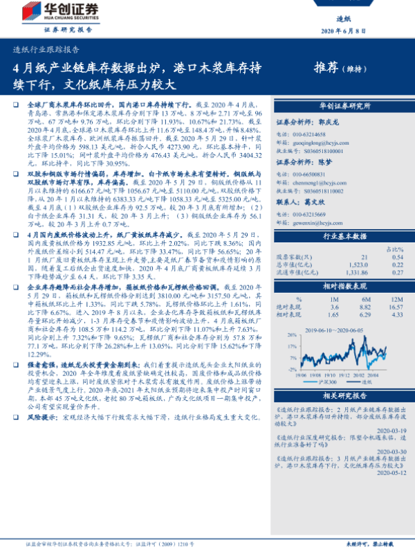 【华创证券】【20200608】20200608-华创证券-造纸行业跟踪报告:4月纸产业链库存数据出炉,港口木浆库存持续下行,文化纸库存压力较大-11页