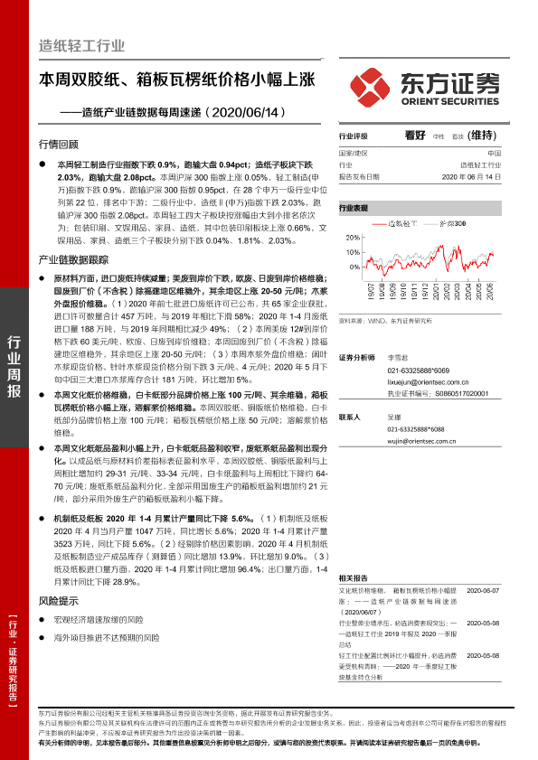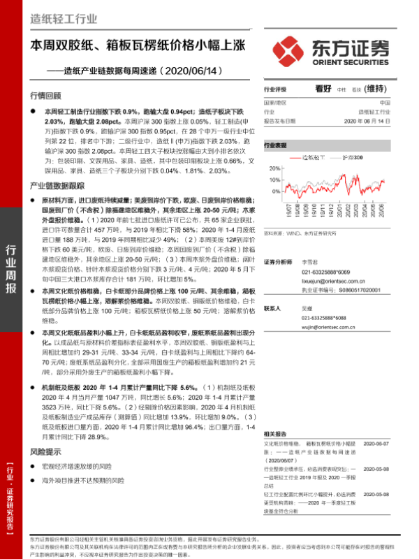 【东方证券】【20200614】20200614-东方证券-造纸产业链数据每周速递:本周双胶纸、箱板瓦楞纸价格小幅上涨-14页