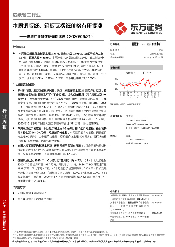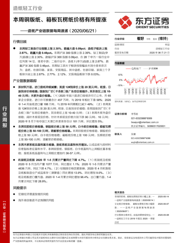 【东方证券】【20200621】20200621-东方证券-造纸产业链数据每周速递:本周铜版纸、箱板瓦楞纸价格有所提涨-15页