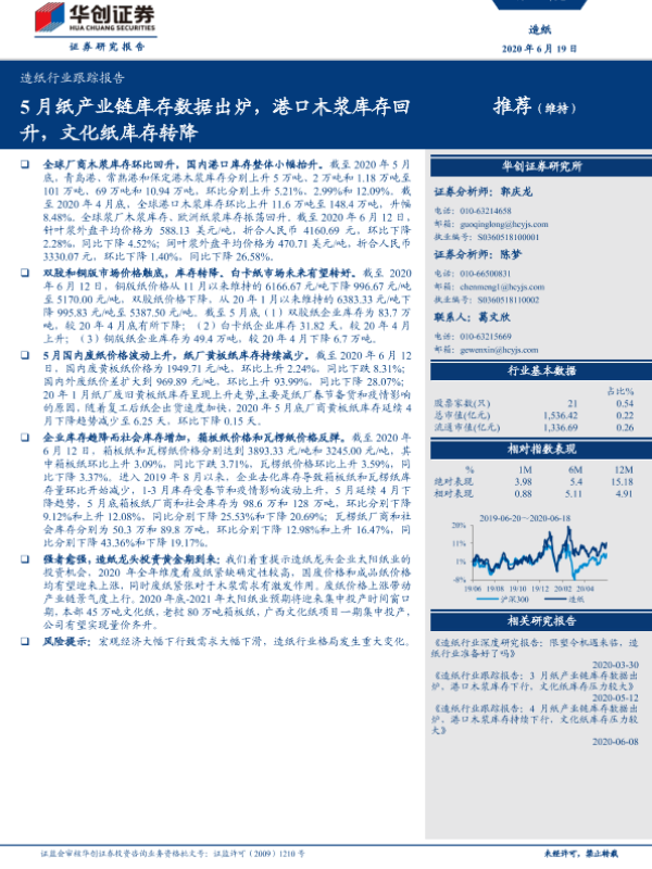 【华创证券】【20200619】20200619-华创证券-造纸行业跟踪报告:5月纸产业链库存数据出炉,港口木浆库存回升,文化纸库存转降-11页