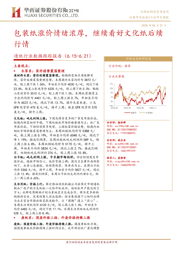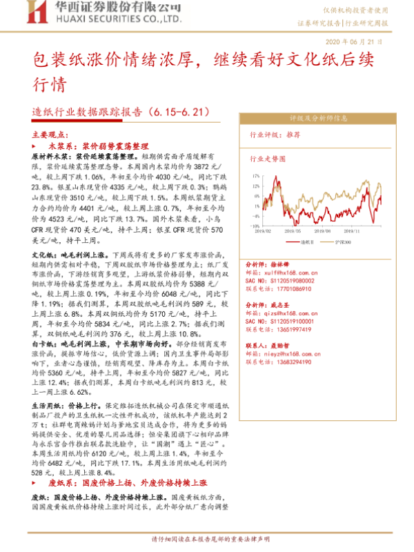 【华西证券】【20200621】20200621-华西证券-造纸行业数据跟踪报告:包装纸涨价情绪浓厚,继续看好文化纸后续行情-11页