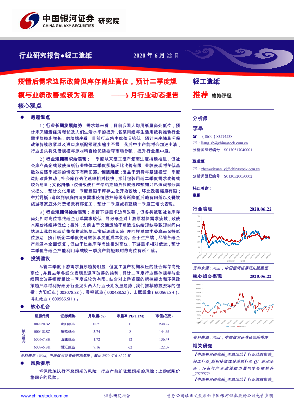 【银河证券】【20200622】20200622-中国银河-轻工造纸行业6月行业动态报告:疫情后需求边际改善但库存尚处高位,预计二季度规模与业绩改善或较为有限-28页
