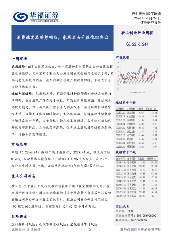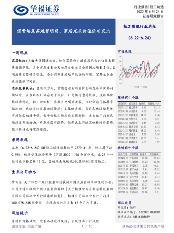 【华福证券】【20200624】20200624-华福证券-轻工制造行业周报:消费端复苏趋势明朗,家居龙头价值依旧突出-10页